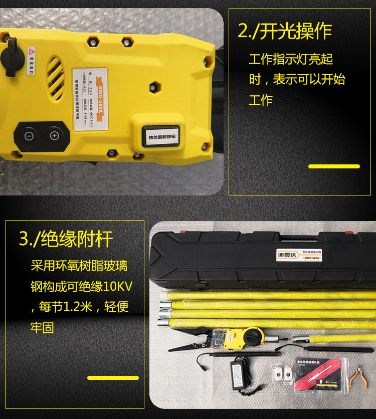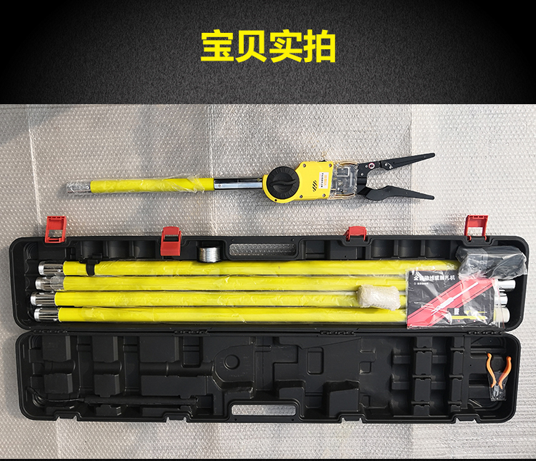 智能線纜捆扎機(jī)一臺、4根90cm絕緣桿、一根43cm電池桿,兩個遙控器、兩盤鐵絲、電池包兩組、一個充電器、絲鉗一把、內(nèi)六角扳手2把、使用說明書一本。