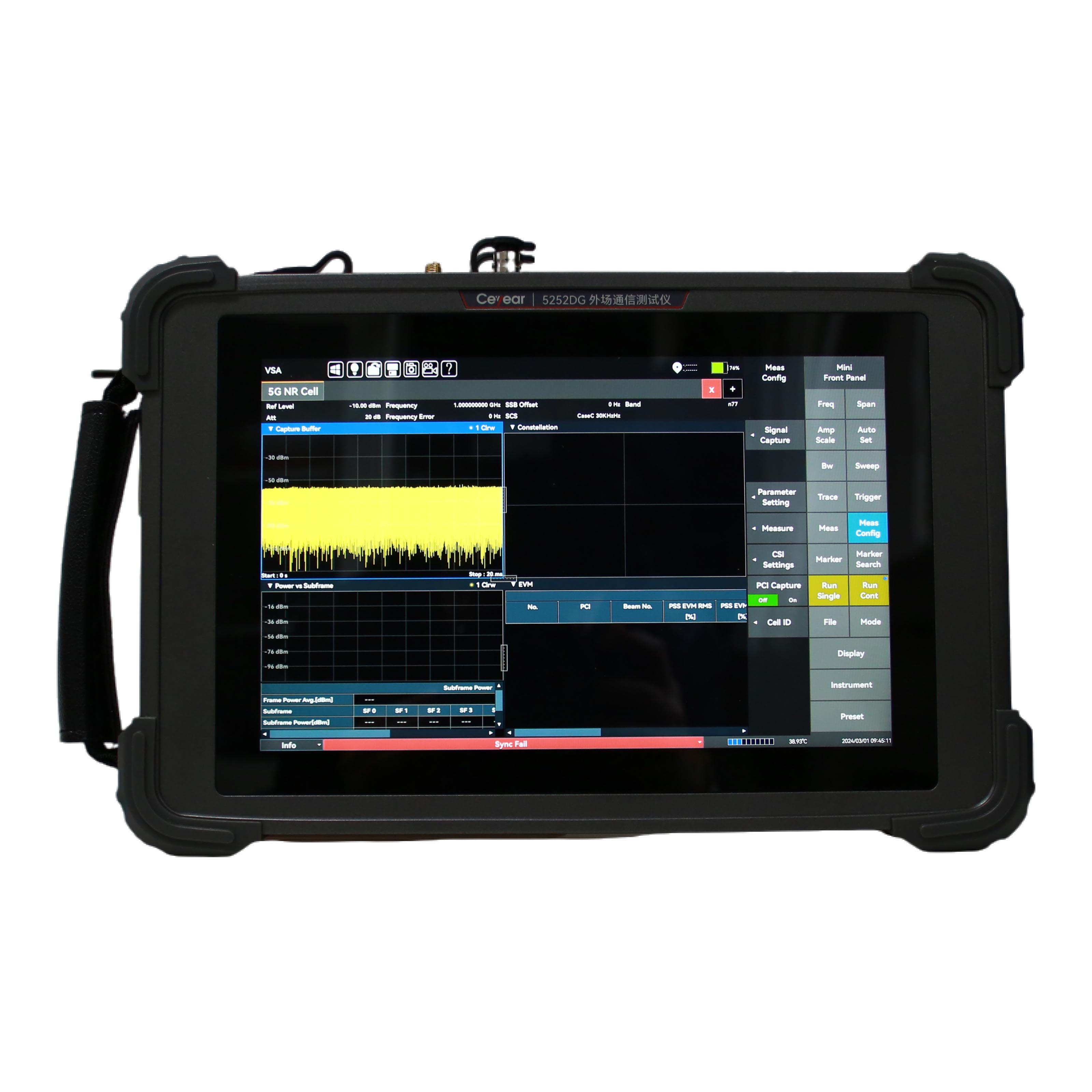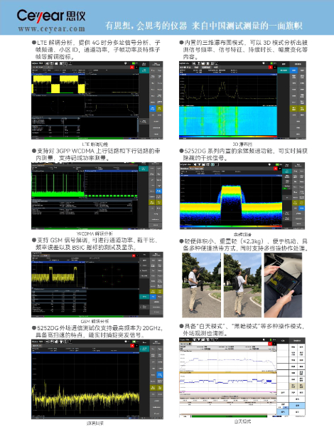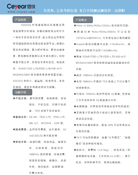 • 5252DG外場通信測試儀是集合高性能信號分析模塊、多制式解析算法軟件于一體的手持式測試儀表,是為滿足運營商對移動通信的測試而推出的全新平臺。其擁有更高測試頻率、更大解析帶寬、更快掃描速度、更低接收靈敏度以及豐富的接口。同時具備干擾分析、無線信號測向定位、場強測試、5GNR/TDD-LTE/FDD-LTE/NB-IoT/WCDMA/GSM信號解析等多種測量功能。5252DG體積小、重量輕、供電靈活、支持云操控,適合外場基站測試與部署。